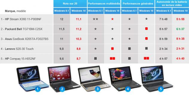Après avoir souligné que le passage à Windows 10 n'a pas toujours été une partie de plaisir, UFC Que Choisir constate que les 5 machines de test sont devenus plus lentes. En outre 4 machines ont vu l'autonomie de leur batterie se réduire, dont une très notablement, près de deux heures.