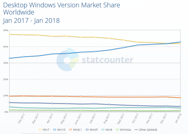 C'est ainsi que Windows 10 vient de dépasser Windows 7, selon les statistiques établies par StatCounter. Au cours du mois de janvier, Windows 10 est passé de 41,69% à 42,78% de parts de marché, tandis que Windows 7 est descendu à 41,86% de parts de marché.