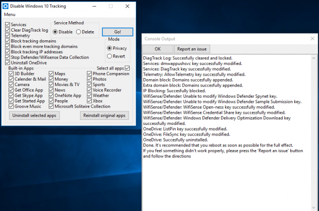 Devant un tel résultat CheesusCrust a voulu pousser plus loin, et relate une seconde expérience dans un second billet. Il a installé sur son Windows 10 le logiciel Disablewintracking. Ce logiciel en Python est disponible sur GitHub. Il s'efforce de bloquer le trafic 'télémétrique' de Windows en configurant son pare-feu. Avec cet outil, CheesusCrust a désinstallé tous les applications livrées avec Windows 10 et listées par l'outil, désactivé également tous les services listés, puis configuré le pare-feu. Ensuite il a laissé tourner son Windows 10 tout seul, cette fois pendant 30 heures.