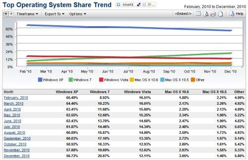 Windows XP reste en tête avec 56.72% de parts de marché  mais est en baisse constante. Il est ainsi frappant de constater (voir c-dessous) le lien direct entre baisse de XP et progression de Windows 7. Manifestement, entreprises et particuliers passent de Windows XP à Windows 7 en se gardant bien de passer par la case Windows Vista. Un Windows Vista qui n'a jamais été populaire, et qui baisse également au profit de Windows 7.