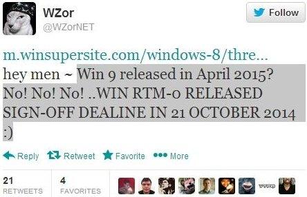 Une autre personne en général très bien informée, mais dans un autre milieu, est le célèbre hacker WZor. Celui-ci vient de tweeter que la dead-line pour la sortie de Windows 9 en version RTM est le 21 octobre 2014. Ce qui signifie concrètement que des machines tournant sous Windows  devraient être sur le marché pour Noël.