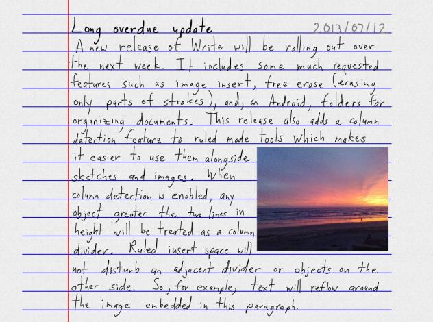 Write traite l'écriture manuscrite et uniquement l'écriture manuscrite. Il sait traiter les mots dont les lettres sont détachées. Il accepte l'insertion d'images, de liens, et gère le texte en multi-colonnes.