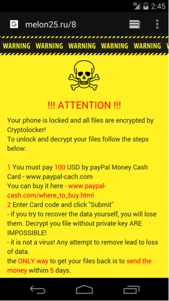 • Xbot peut également verrouiller à distance les appareils Android infectés, chiffrer les fichiers de l’utilisateur sur un dispositif de stockage externe (carte SD, par exemple), puis demander une rançon d’un montant de 100 dollars payable par cash card PayPal.