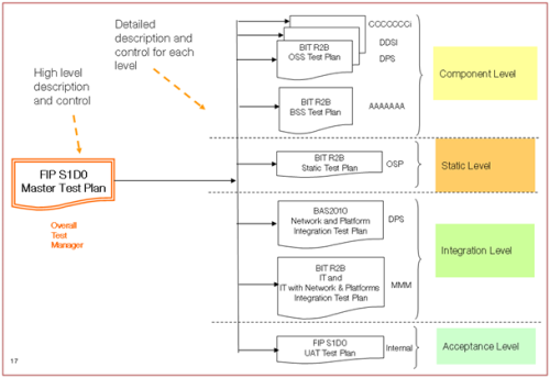 Dans l'exemple ci-dessous, un « Master Test Plan » a permis de définir une stratégie globale de test pour un projet complexe d'évolution d'un SI, faisant appel à de nombreux sous-traitants. Par exemple, chaque composant développé a donné lieu à la rédaction d'un Plan de Test référencé par le Plan de Test maître.