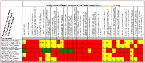 Même si c'est un sous-traitant qui est en charge des tests unitaires du composant qu'il développe, revoir le Plan de Test associé permettra d'avoir des garanties sur la façon avec laquelle ce composant sera testé. L'exemple ci-dessous montre le résultat d'une revue faire sur 5 plans de test réalisés par un sous-traitant sur la base d'un même template. Chaque ligne correspond à un plan de test et chaque colonne à un chapitre du plan de test. Cette revue a mis en évidence une grande faiblesse concernant le test chez le sous-traitant et a donné lieu immédiatement à un plan d'action d'amélioration.