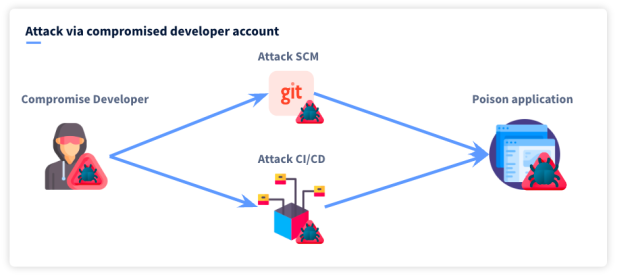 Plus précisément, nous allons examiner comment ils peuvent accéder aux systèmes de gestion du code source (SCM) comme git et aux pipelines de CI/CD. Nous examinerons le chemin qu'empruntent les attaquants pour y parvenir, à savoir :