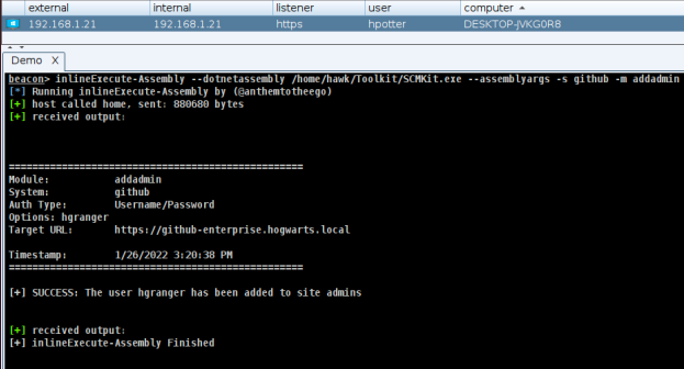 Tout attaquant essaiera d'obtenir l'accès à un compte administrateur. Il peut y parvenir après avoir accédé à un SSH ordinaire ou à destokens d'utilisateur lors de la phase de reconnaissance de l'attaque. Pour maintenir sa présence, l'attaquant voudra promouvoir ou créer de nouveaux comptes avec un accès administrateur pour éviter d'être bloqué. En utilisant le kit SCM, un attaquant pourrait très rapidement trouver un accès administrateur et promouvoir un nouvel utilisateur avec un accès API via l'outil du kit SCM. Ainsi, même si l'accès administrateur original est révoqué, l'attaquant maintiendra son authentification.
