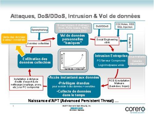 Mais ce qui est plus inquiétant aujourd’hui, c’est qu’une même attaque combine plusieurs moyens utilisés à l’origine individuellement. Ce sont les fameuses APT évoquées précédemment, dans lesquelles les attaquants suivent de véritables plans de bataille, déchiffrables étape par étape, mais souvent lorsqu’il est trop tard.