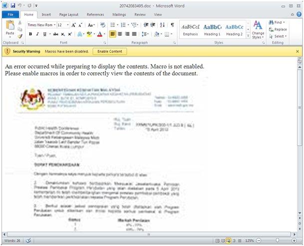 • La plupart des pièces jointes malveillantes envoyées par courrier électronique sont vides ou utilisent un leurre générique du type « Activez les macros pour afficher ce document ». Toutefois, la campagne limitée Dridex 121 du 19 octobre a utilisé un document intéressant en guise de leurre (Fig. 2)