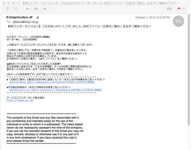 Figure 3 : Courrier électronique affichant une confirmation de commande en guise de leurre et diffusant Shifu auprès d'utilisateurs japonais