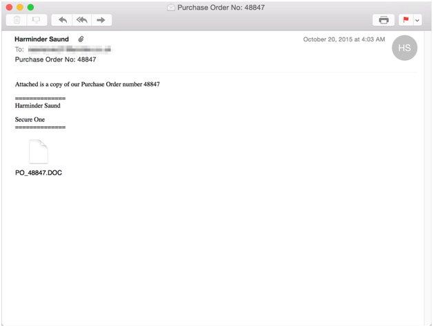 Le 20 octobre, une autre campagne utilisant des messages avec l'objet « Numéro de bon de commande : 48847 » et contenant la pièce jointe « PO_48847.DOC » ou avec l'objet « jean.durand@société.com » (l'adresse du destinataire) et la pièce jointe « FINAL NOTIFICATION.xls » a été repérée. Les pièces jointes sont des documents Microsoft Office, qui contiennent des macros malveillantes téléchargeant le cheval de Troie bancaire Shifu auprès de clients de banques britanniques. [4] (Fig. 4)