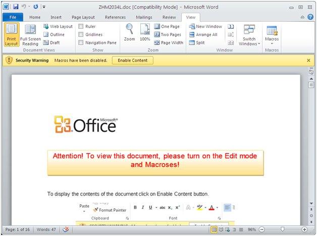 En octobre, il a été découvert que ce botnet de spams a également procédé à la diffusion du programme malveillant Ursnif. Par exemple, le 21 octobre, dans le cadre d'une campagne d'envoi de courriers électroniques contenant des pièces jointes nommées de façon aléatoire à des utilisateurs australiens, des macros malveillantes ont été utilisées pour télécharger Ursnif. Il est intéressant de constater que les documents se présentaient de la même façon que lors de la diffusion du sous-botnet 200 Dridex au mois d'avril 2015. (Figure 5)