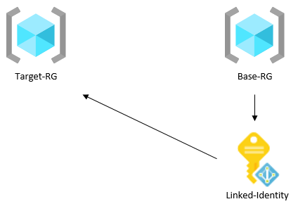 Par exemple, un groupe de ressources Base-RG, qui contient une identité gérée Linked-Identity avec des autorisations de gestion, est affecté à un autre groupe de ressources Target-RG.