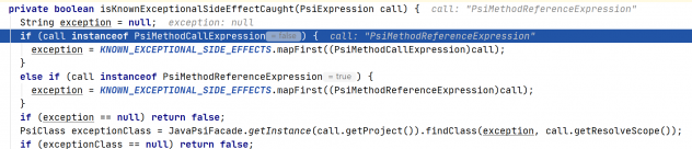 Vous voyez les indications “= false” et “= true” ? Elles sont ajoutées par la DFA. Vous savez maintenant que le premier if ne sera pas exécuté, alors que le second le sera. Il semble que le débogueur se contente d'évaluer l'expression qu'il voit dans le code et l'affiche. Mais ce n'est pas exactement le cas. Vous voyez la ligne if (exception == null) return false; ? Le débogueur sait désormais que exception est null, donc exception == null est vrai. Toutefois, la DFA sait également que la variable exception peut être réaffectée au moment où cette condition est exécutée. Par conséquent, il ne tire pas de conclusions hâtives, mais affiche les résultats uniquement pour les conditions qui devraient avoir la valeur affichée lorsqu'elles sont effectivement exécutées. Il sait que la valeur d'une variable peut changer et parfois il sait même précisément comment elle va changer :