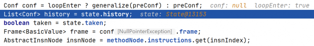 Comme conf est null et ne change clairement pas avant l'opérateur de déréférence, un NPE est inévitable ici et la DFA vous le dit. En étant informé à l'avance, vous évitez de vous retrouver finalement bloqué et d'avoir à revenir plus haut dans la trame sans comprendre pourquoi cela s'est produit. Voici un autre exemple :