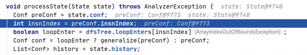Nous ne le voyons pas dans l'éditeur, mais nous savons que preConf.insnIndex est négatif à ce stade. Ainsi, nous savons déjà que dfsTree.loopEnters[insnIndex] échouera avec AIOOBE. De plus, la DFA signale actuellement ClassCastException, ArrayStoreException, faisant passer un null garanti pour un paramètre annoté comme @NotNull et une violation du contrat de méthode :