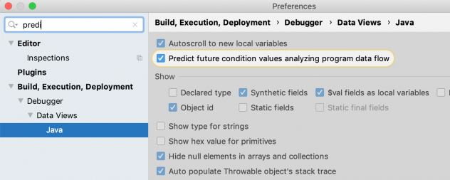 Cette fonctionnalité est disponible à partir de l'EAP v2020.1. Si vous n'aimez pas cette fonctionnalité, vous pouvez la désactiver en décochant l'option Predict future condition values… dans Preferences / Settings | Build, Execution, Deployment | Debugger | Data Views | Java :