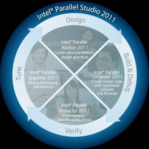 Intel Parallel Studio 2011 est la suite complète des 4 outils, Advisor, Composer, Inspector et Amplifier qui s’intègrent en plug-in dans les versions 2005, 2008 and 2010 Visual Studio de Microsoft et peuvent être utlisés ensembles ou séparément.