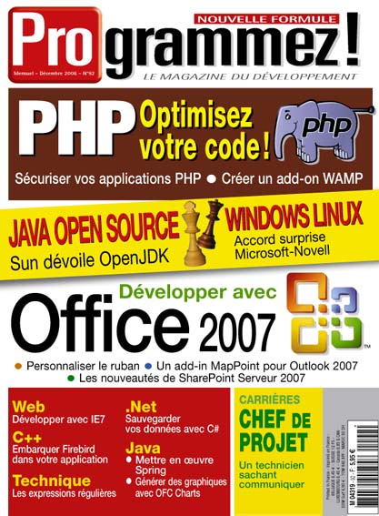 Dans programmez! PDF #92 Paru le 01/12/2006 S'ABONNER Evénements Microsoft adoube Linux Lire la suite de Microsoft adoube Linux TechEd 2006 : dans la continuité de .Net 3.0 Lire la suite de TechEd 2006 : dans la continuité de .Net 3.0 Zend conference 2006 Lire la suite de Zend conference 2006 Java devient Open source Lire la suite de Java devient Open source Adobe Max 06 Lire la suite de Adobe Max 06 Portrait Ilog, un champion français et international Lire la suite de Ilog, un champion français et international Test WinDev Express : l’atelier à tout faire Lire la suite de WinDev Express : l’atelier à tout faire Intellij IDEA 6.0 Lire la suite de Intellij IDEA 6.0 NetAdvantage for JSF Lire la suite de NetAdvantage for JSF SGBD Oracle mise sur Linux et Oracle 11g Lire la suite de Oracle mise sur Linux et Oracle 11g Office Office 2007 à l’assaut de vos données Lire la suite de Office 2007 à l’assaut de vos données Mettez un peu de MapPoint dans votre Outlook 2007 ! Lire la suite de Mettez un peu de MapPoint dans votre Outlook 2007 ! Microsoft Office SharePoint Server 2007 Lire la suite de Microsoft Office SharePoint Server 2007 Visual Studio 2005 Tools For Office Second Edition Lire la suite de Visual Studio 2005 Tools For Office Second Edition Personnaliser le ribbon d’Office Oui Lire la suite de Personnaliser le ribbon d’Office Carrière Chef de projet : un technicien sachant communiquer Lire la suite de Chef de projet : un technicien sachant communiquer Dossier Web Services Sécurité et interopérabilité (2e partie) Lire la suite de Web Services Sécurité et interopérabilité (2e partie) Optimisez vos applications PHP Oui Lire la suite de Optimisez vos applications PHP Développement Web Internet Explorer 7 et Firefox 2 : le navigateur redynamisé Lire la suite de Internet Explorer 7 et Firefox 2 : le navigateur redynamisé IE7 : quelles incidences pour le développeur ? Lire la suite de IE7 : quelles incidences pour le développeur ? Technique Les expressions régulières Lire la suite de Les expressions régulières Code Utliser la bibliothèque graphique OFC Charts Lire la suite de Utliser la bibliothèque graphique OFC Charts Spring et les transactions déclaratives Oui Lire la suite de Spring et les transactions déclaratives Sauvegardez vos données à travers le réseau avec C#2.0 Oui Lire la suite de Sauvegardez vos données à travers le réseau avec C#2.0 Embarquez Firebird dans une application C++ Oui Lire la suite de Embarquez Firebird dans une application C++ Ludique Programmer en quelques clics ! Lire la suite de Programmer en quelques clics !