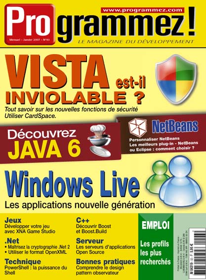 Dans programmez! PDF #93 Paru le 01/01/2007 S'ABONNER Evénements Microsoft Expression : des outils pour le Web Lire la suite de Microsoft Expression : des outils pour le Web Java 6, toujours dynamique Lire la suite de Java 6, toujours dynamique Les nouveautés Java 6 Lire la suite de Les nouveautés Java 6 Portrait JBuilder 2007 pointe son nez Lire la suite de JBuilder 2007 pointe son nez SGBD Base de données et goulets d’étranglement Lire la suite de Base de données et goulets d’étranglement Dossier Windows Live Oui Lire la suite de Windows Live Mon NetBeans idéal Lire la suite de Mon NetBeans idéal Projets Le SCM Perforce 2006.1 Lire la suite de Le SCM Perforce 2006.1 Sécurité Windows Vista : la sécurité revisitée Lire la suite de Windows Vista : la sécurité revisitée Les améliorations de la sécurité de Windows Vista Lire la suite de Les améliorations de la sécurité de Windows Vista Windows CardSpace : en route vers l’identité Lire la suite de Windows CardSpace : en route vers l’identité Carrière Employeurs cherchent candidats Lire la suite de Employeurs cherchent candidats Les profils et les salaires les plus recherchés : bilan d’une année exceptionnelle Lire la suite de Les profils et les salaires les plus recherchés : bilan d’une année exceptionnelle Développement Web Panorama des serveurs d’applications open source Lire la suite de Panorama des serveurs d’applications open source Technique A la découverte de PowerShell Lire la suite de A la découverte de PowerShell Code Faire de la cryptographie sous .Net Lire la suite de Faire de la cryptographie sous .Net OpenXML et .Net Oui Lire la suite de OpenXML et .Net Comprendre le Design Pattern Observateur Oui Lire la suite de Comprendre le Design Pattern Observateur Boostez votre code C++ Lire la suite de Boostez votre code C++ Boost.Build, un outil de construction de projets C et C++ Oui Lire la suite de Boost.Build, un outil de construction de projets C et C++ Temps libre Introduction à XNA Game Studio Express Oui Lire la suite de Introduction à XNA Game Studio Express