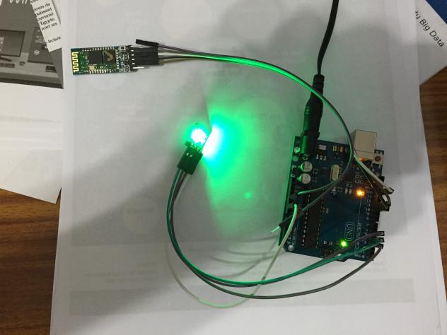 Nous avons testé le montage avec une classique Arduino Uno, un module HC-05 et une LEB RGB.