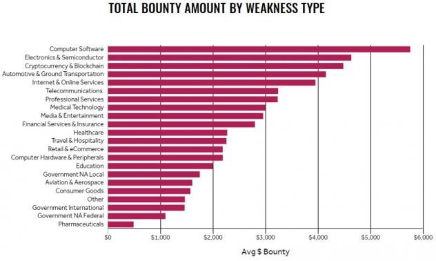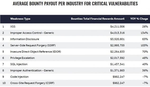 - Les vulnérabilités de type Cross-site Scripting (XSS) restent une menace majeure pour les applications web, car les attaquants exploitant les attaques XSS peuvent prendre le contrôle du compte de l'utilisateur et dérober des informations personnelles telles que les mots de passe, les numéros de compte bancaire, les informations relatives aux cartes de crédit, les informations d'identification personnelle (IIP), les numéros de sécurité sociale, etc. Les vulnérabilités XSS figurent parmi les plus récompensées depuis deux ans, et ont coûté aux entreprises un total de 4,2 millions $, soit une augmentation de 26 % en un an. Si ces bugs représentent 18 % des vulnérabilités signalées, la récompense moyenne n’est que de 501 $. Quand on sait que la prime moyenne pour une vulnérabilité critique s’élève généralement à 3 650 $, on en déduit que les entreprises parviennent à atténuer ce risque majeur de manière très rentable.
