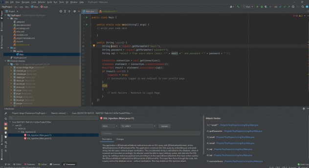 Il est à noter que Checkmarx propose au sein d’IntelliJ une vue permettant au développeur de parcourir le vecteur d’attaque directement dans l’IDE, ainsi le développeur peut consulter les résultats d’analyse Checkmarx directement dans son environnement de travail.