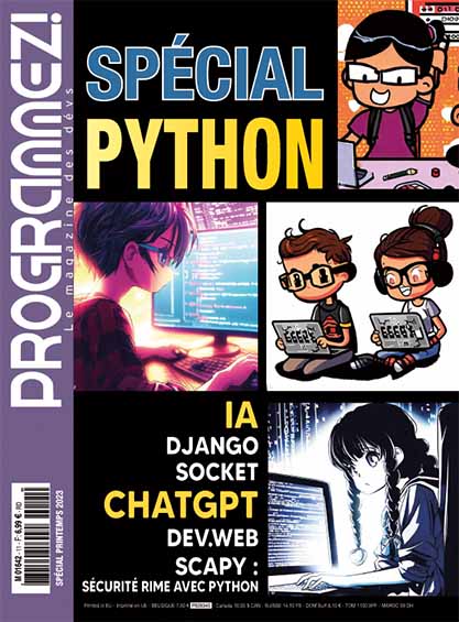 Dans programmez! papier Hors série #11 Paru le 02/06/2023 S'ABONNER Histoire du langage Python : toute une histoire… Lire la suite de Python : toute une histoire… Atouts du langage Python : mais pourquoi ? Lire la suite de Python : mais pourquoi ? Ecosystème Parole aux acteurs Lire la suite de Parole aux acteurs Qualité du code Python : les pièges à éviter… Lire la suite de Python : les pièges à éviter… Développement web DjangoVue : ma stack technique favorite pour le développement web Lire la suite de DjangoVue : ma stack technique favorite pour le développement web Utilisation de Python pour le Web 1 Lire la suite de Utilisation de Python pour le Web Intelligence artificielle Le Deep Learning facile avec Python 1 Lire la suite de Le Deep Learning facile avec Python Introduction à la programmation d’une Intelligence Artificielle en Python 1 Lire la suite de Introduction à la programmation d’une Intelligence Artificielle en Python Métier Python dans la plateforme X4B 1 Lire la suite de Python dans la plateforme X4B Projet Générer automatiquement la release note d’un projet 1 Lire la suite de Générer automatiquement la release note d’un projet Réseau Les fonctionnalités de Scapy Lire la suite de Les fonctionnalités de Scapy Python et les sockets Lire la suite de Python et les sockets SGDBR SQL & Python Lire la suite de SQL & Python Conteneurisation Installer psycopg2 dans une image docker python Lire la suite de Installer psycopg2 dans une image docker python Données temporelles Gestion des fuseaux horaires en Python Lire la suite de Gestion des fuseaux horaires en Python