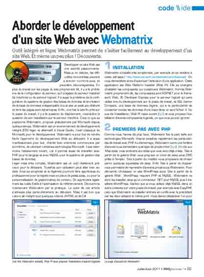 Développer un site Web est une activité passionnante. Mais si on débute, les difficultés rencontrées peuvent s’avérer nombreuses et peut-être décourageantes. En plus du travail sur les pages du site proprement dit, il y a le problème de la configuration du serveur, qu’il s’agisse du serveur matériel(la machine) ou du serveur logiciel. Il a aussi le problème de la configuration du système de gestion des bases de données et la création de la base de données indispensable à tout site un petit peu élaboré et dont les pages sont dynamiques. Enfin, une fois le site fin prêt sur le poste du travail, il y a la question du déploiement, c’est-à-dire la question de son installation sur le serveur machine. C’est ici que se positionne Webmatrix, proposé gratuitement par Microsoft depuis quelque temps. Webmatrix est un environnement de développement intégré (EDI) léger et alternatif à Visual Studio, l’outil classique de Microsoft pour le développement. Webmatrix a pour but de rendre facile l’approche du développement Web au débutant. Il a aussi manifestement pour but, charité bien ordonnée commençant par soi-même, de valoriser certaines technologies Microsoft. Il est néanmoins relativement ouvert, car il permet aussi de travailler avec PHP pour le langage et avec MySQL pour le système de gestion des bases de données.