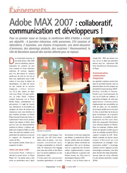 Dès la première keynote, le ton était donné : RIA, RDA (pour le desktop), personnalisation du contenu au lieu d’un contenu et d’une interface uniforme. Et surtout, rappeler que l’on doit placer le contenu au-dessus de tout (IL est roi) et faire une application pour l’utilisateur et non pour le plaisir du développeur. La vidéo fut aussi un axe central de la session inaugurale. L’éditeur annonce que 90 % des vidéos en ligne sont sous Flash ! Et pour renforcer, la vidéo Flash, l’éditeur compte beaucoup sur le Flash Media Player (actuellement en pré-version). Il s'agit de fournir aux utilisateurs la possibilité de naviguer, de créer, de monter des séquences avec une interface la plus intuitive possible. Le Media Player promet beaucoup même si maintenant il faut voir les améliorations par rapport à Flash. Quoi qu'il en soit, les démonstrations méritent le détour. L’éditeur rappelle qu'il supporte H264, le côté video tire parti du matériel, et en particulier du multicore ou encore