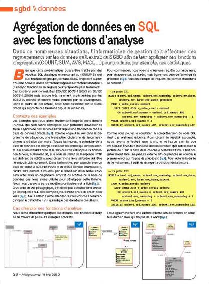 Bien que cette problématique puisse être traitée par des requêtes SQL classiques en recourant au « GROUP BY » et aux fonctions de groupe, certains SGBD proposent aujourd'hui une nouvelle classe de fonctions appelées « fonctions d'analyse » (« Analytic Functions » en anglais) pour y répondre plus facilement. Ces fonctions sont normalisées (ISO/IEC 9075-1:2003 et ISO/IEC 9075-1:2008) mais encore très rarement implémentées par les SGBD du marché et encore moins connues par les développeurs. Dans le cadre de cet article, nous nous baserons sur le SGBD Oracle qui supporte ces fonctions depuis sa version 8i.