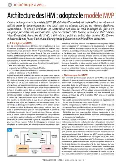 Connu de longue date, le modèle MVC (Model-View-Controller) est aujourd’hui massivement utilisé pour le développement des IHM tant au niveau web qu’au niveau desktop. Néanmoins, le besoin croissant en testabilité des IHM le rend inadapté du fait d’un couplage fort entre ses composantes. Afin de combler cette lacune, le modèle MVP (Model- View-Presenter), évolution du MVC, a été mis au point au milieu des années 90. Encore méconnu de nos jours, il se révèle d’une grande puissance et mérite d’être découvert.