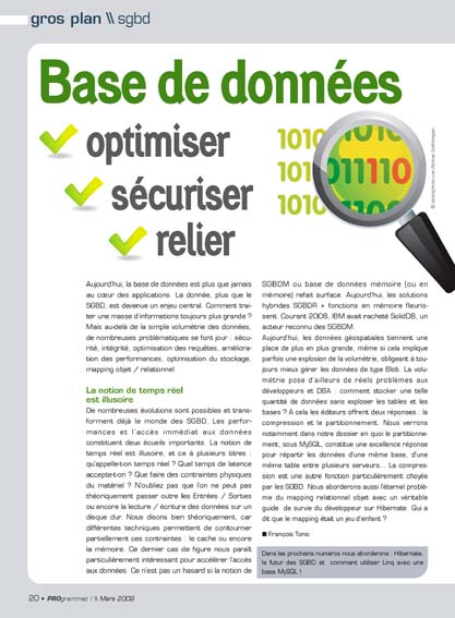 Aujourd’hui, la base de données est plus que jamais au coeur des applications. La donnée, plus que le SGBD, est devenue un enjeu central. Comment traiter une masse d’informations toujours plus grande ? Mais au-delà de la simple volumétrie des données, de nombreuses problématiques se font jour : sécurité, intégrité, optimisation des requêtes, amélioration des performances, optimisation du stockage, mapping objet / relationnel.