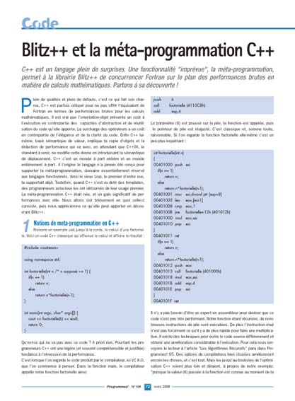 Plein de qualités et plein de défauts, c'est ce qui fait son charme, C++ est parfois critiqué pour ne pas offrir l'équivalent de Fortran en termes de performances brutes pour les calculs mathématiques. Il est vrai que l'orientation-objet présente un coût à l'exécution en contrepartie des capacités d'abstraction et de réutilisation du code qu'elle apporte. La surcharge des opérateurs a un coût en contrepartie de l'élégance et de la clarté du code. Enfin C++ luimême, basé sémantique de valeur, implique la copie d'objets et la réduction de performance qui va avec, en attendant que C++0X, le standard à venir, ne modifie cette donne en introduisant la sémantique de déplacement. C++ c'est un monde à part entière et un monde entièrement à part. A l'origine le langage n'a jamais été conçu pour supporter la méta-programmation, domaine essentiellement réservé aux langages fonctionnels. Ainsi le vieux Lisp, le premier d'entre eux, la supportait déjà. Toutefois, quand C++ s'est vu doté des templates, des programmeurs astucieux les ont détournés de leur usage premier. La méta-programmation C++ était née, et un gain significatif de performances avec elle. Nous allons voir brièvement en quoi celle-ci consiste, puis nous apprécierons ce qu'elle peut apporter en découvrant Blitz++.