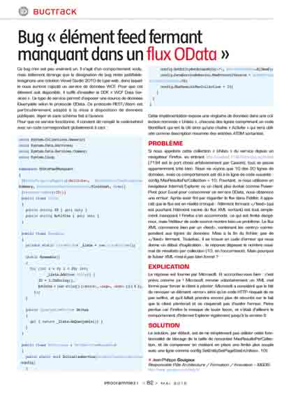 Ce bug n’en est pas vraiment un. Il s’agit d’un comportement voulu, mais tellement étrange que la désignation de bug reste justifiable. Imaginons une solution Visual Studio 2010 de type web, dans laquelle nous aurions rajouté un service de données WCF. Pour que cet élément soit disponible, il suffit d’installer le SDK « WCF Data Services ». Ce type de service permet d’exposer une source de données IQueryable selon le protocole OData. Ce protocole REST/Atom est particulièrement adapté à la mise à disposition de données publiques, léger et sans schéma fixé à l’avance.