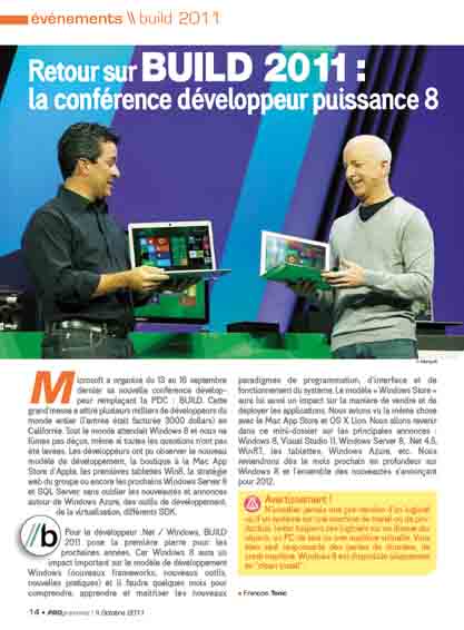 Microsoft a organisé du 13 au 16 septembre dernier sa nouvelle conférence développeur remplaçant la PDC : BUILD. Cette grand’messe a attiré plusieurs milliers de développeurs du monde entier (l’entrée était facturée 3000 dollars) en Californie. Tout le monde attendait Windows 8 et nous ne fûmes pas déçus, même si toutes les questions n’ont pas été levées. Les développeurs ont pu observer le nouveau modèle de développement, la boutique à la Mac App Store d’Apple, les premières tablettes Win8, la stratégie web du groupe ou encore les prochains Windows Server 8 et SQL Server, sans oublier les nouveautés et annonces autour de Windows Azure, des outils de développement, de la virtualisation, différents SDK. Pour le développeur .Net / Windows, BUILD 2011 pose la première pierre pour les prochaines a nnées. C ar W indows 8 a ura u n impact important sur le modèle de développement Windows (nouveaux frameworks, nouveaux outils, nouvelles pratiques) et il faudra quelques mois pour comprendre, apprendre et maîtriser les nouveaux paradigmes de programmation, d’interface et de fonctionnement du système. Le modèle « Windows Store » aura lui aussi un impact sur la manière de vendre et de déployer les applications. Nous avions vu la même chose avec le Mac App Store et OS X Lion. Nous allons revenir dans ce mini-dossier sur les principales annonces : Windows 8, Visual Studio 11, Windows Server 8, .Net 4.5, WinRT, les tablettes, Windows Azure, etc. Nous reviendrons dès le mois prochain en profondeur sur Windows 8 et l’ensemble des nouveautés s’annonçant pour 2012.