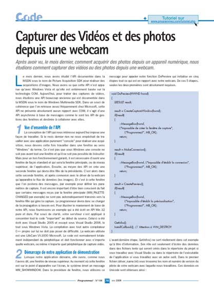 Le mois dernier, nous avons étudié l'API documentée dans la MSDN sous le nom de Picture Acquisition SDK pour réaliser des acquisitions d'images. Nous avons vu que cette API n'est apparue qu'avec Windows Vista et qu'elle est entièrement basée sur la technologie COM. Aujourd'hui, pour traiter des captures de vidéos, nous étudions une API beaucoup ancienne qui est documentée dans la MSDN sous le nom de Windows Multimedia SDK. Dans un souci de cohérence que l'on retrouve assez fréquemment chez Microsoft, cette API ne présente absolument aucun rapport avec COM, il s’agit d’une API asynchrone à base de messages comme le sont les API de gestions des fenêtres et destinée à collaborer avec elles.