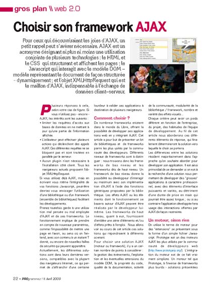 • Aucun plug-in n’est nécessaire à l'installation côté client. Tous les navigateurs actuels proposent l'objet XMLHttpRequest. Si vous utilisez déjà AJAX, mais en écrivant vous même l'intégralité de vos fonctions Javascript, peut-être devriez vous envisager l'utilisation d'une bibliothèque ou d'un framework (ensemble de bibliothèques) facilitant les développements. Prenez toutefois garde à une utilisation mal pensée ou mal employée d'AJAX et de ses frameworks. Le fonctionnement implique de prendre en compte de nouveaux paramètres, comme l'impossibilité de mettre une page en favori, au sens où on l'entend, avec son contenu à un instant T donné, ou encore de nouvelles failles de sécurité qui peuvent apparaître. Actuellement, les différentes solutions sont dans leurs dernières versions, compatibles avec la plupart des navigateurs Internet, ce qui permet de s'affranchir d'une certaine lourdeur à valider ses applications à destination de plusieurs navigateurs.