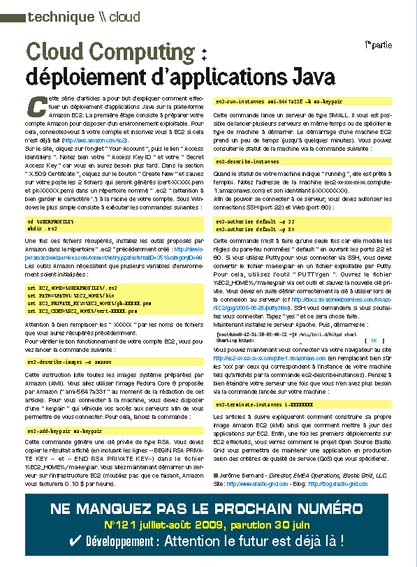 Cette série d’articles a pour but d’expliquer comment effectuer un déploiement d’applications Java sur la plate-forme Amazon EC2. La première étape consiste à préparer votre compte Amazon pour disposer d’un environnement exploitable. Pour cela, connectez-vous à votre compte et inscrivez vous à EC2 si cela n’est déjà fait (http://aws.amazon.com/ec2). Sur le site, cliquez sur l’onglet " Your Account ", puis le lien " Access Identifiers ". Notez bien votre " Access Key ID " et votre " Secret Access Key " car vous en aurez besoin plus tard. Dans la section " X.509 Certificate ", cliquez sur le bouton " Create New " et sauvez sur votre poste les 2 fichiers qui seront générés (cert-XXXXX.pem et pk-XXXXX.pem) dans un répertoire nommé " .ec2 " (attention à bien garder le caractère ‘.’) à la racine de votre compte.