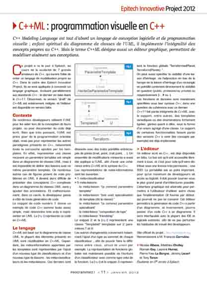 Ce projet a vu le jour à Epitech, au cours de la scolarité de 7 grands amateurs de C++, qui eurent l’idée de créer un langage de modélisation propre au C++. Dans le cadre des Epitech Innovative Project, ils se sont appliqués à concevoir un langage graphique, évoluant parallèlement aux standards C++ ; le dernier en date étant le C++11. Désormais, la version “draft” de C++ML est entièrement rédigée, et l’éditeur est disponible en version bêta.