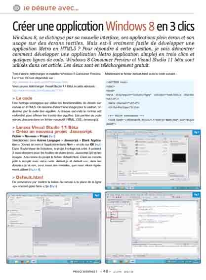 Windows 8, se distingue par sa nouvelle interface, ses applications plein écran et son usage sur des écrans tactiles. Mais est-il vraiment facile de développer une application Metro en HTML5 ? Pour répondre à cette question, je vais démontrer comment développer une application Metro (application simple) en trois clics et quelques lignes de code. Windows 8 Consumer Preview et Visual Studio 11 bêta sont utilisés dans cet article. Les deux sont en téléchargement gratuit.