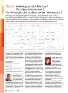 Durant la journée développeur organisée à l’école ESGI, le 16 janvier 2014, un des sujets de discussion fut le langage orienté objet, s’il fallait continuer à l’enseigner et s’il était possible de savoir si ce paradigme était toujours pertinent; d’autres langages, comme Python, apportent des réponses claires à des problématiques métiers ou applicatives. Et l’objet n’est pas la réponse à tout.