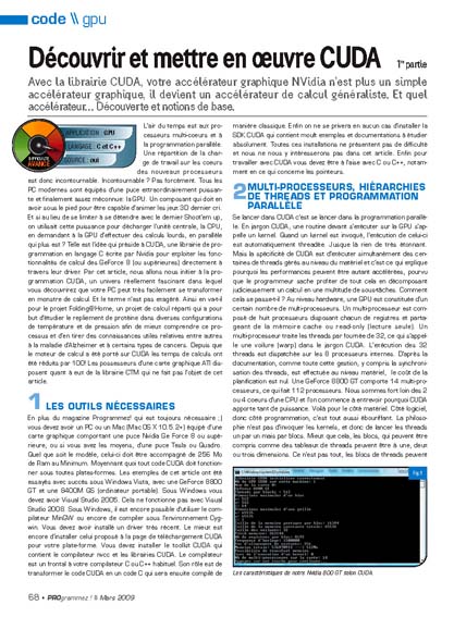 L'air du temps est aux processeurs multi-coeurs et à la programmation parallèle. Une répartition de la charge de travail sur les cœurs des nouveaux processeurs est donc incontournable. Incontournable ? Pas forcément. Tous les PC modernes sont équipés d'une puce extraordinairement puissante et finalement assez méconnue: la GPU. Un composant qui doit en avoir sous le pied pour être capable d'animer les jeux 3D dernier cri. Et si au lieu de se limiter à se détendre avec le dernier Shoot'em up, on utilisait cette puissance pour décharger l'unité centrale, la CPU, en demandant à la GPU d'effectuer des calculs lourds, en parallèle qui plus est ? Telle est l'idée qui préside à CUDA, une librairie de programmation en langage C écrite par Nvidia pour exploiter les fonctionnalités de calcul des GeForce 8 (ou supérieures) directement à travers leur driver. Par cet article, nous allons nous initier à la programmation CUDA, un univers réellement fascinant dans lequel vous découvrirez que votre PC peut très facilement se transformer en monstre de calcul. Et le terme n'est pas exagéré. Ainsi en va-t-il pour le projet Folding@Home, un projet de calcul réparti qui a pour but d'étudier le repliement de protéine dans diverses configurations de température et de pression afin de mieux comprendre ce processus et d'en tirer des connaissances utiles relatives entre autres à la maladie d'Alzheimer et à certains types de cancers. Depuis que le moteur de calcul a été porté sur CUDA les temps de calculs ont été réduits par 100! Les possesseurs d'une carte graphique ATI disposent quant à eux de la librairie CTM qui ne fait pas l'objet de cet article.