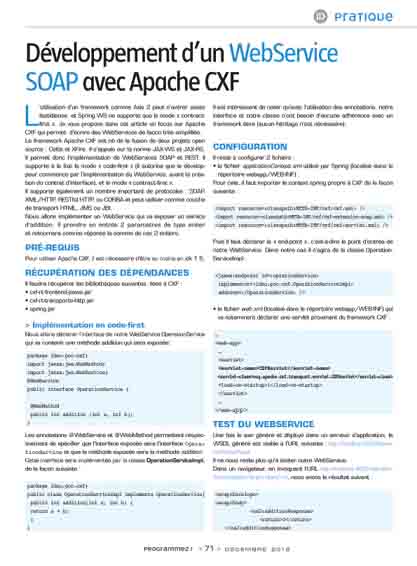 L’utilisation d’un framework comme Axis 2 peut s’avérer assez fastidieuse, et Spring WS ne supporte que le mode « contractfirst ». Je vous propose dans cet article un focus sur Apache CXF qui permet d’écrire des WebServices de façon très simplifiée. Le framework Apache CXF est né de la fusion de deux projets open source : Celtix et XFire. Il s’appuie sur la norme JAX-WS et JAX-RS. Il permet donc l’implémentation de WebServices SOAP et REST. Il supporte à la fois le mode « code-first » (il autorise que le développeur commence par l’implémentation du WebService, avant la création du contrat d’interface), et le mode « contract-first ». Il supporte également un nombre important de protocoles : SOAP, XML/HTTP, RESTful HTTP, ou CORBA et peut utiliser comme couche de transport HTML, JMS ou JBI. Nous allons implémenter un WebService qui va exposer un service d’addition. Il prendra en entrée 2 paramètres de type entier et retournera comme réponse la somme de ces 2 entiers.