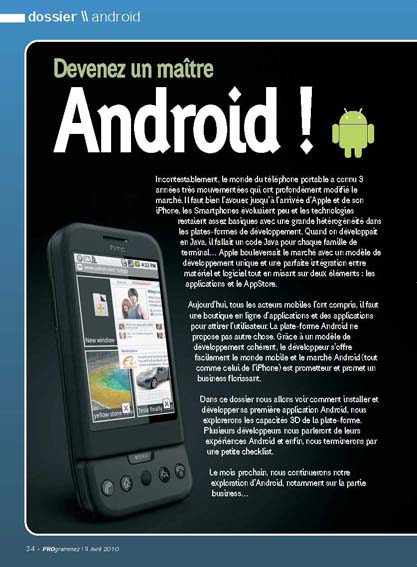 Dans ce dossier nous allons voir comment installer et développer sa première application Android, nous explorerons les capacités 3D de la plate-forme. Plusieurs développeurs nous parleront de leurs expériences Android et enfin, nous terminerons par une petite checklist.