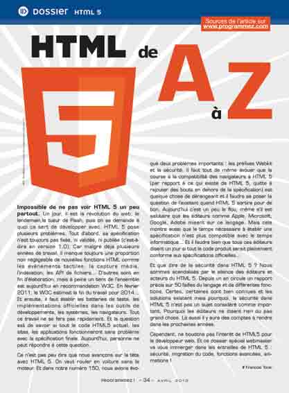 Un jour, il est la révolution du web, le lendemain,le tueur de Flash, puis on se demande à quoi ça sert de développer avec. HTML 5 pose plusieurs problèmes. Tout d’abord, sa spécification n’est toujours pas fixée, ni validée, ni publiée (c’est-àdire en version 1.0). Car malgré déjà plusieurs années de travail, il manque toujours une proportion non négligeable de nouvelles fonctions HTML comme les événements tactiles, la capture média, l’indexation, les API de fichiers… D’autres sont en fin d’élaboration, mais à peine un tiers de l’ensemble est aujourd’hui en recommandation W3C. En février 2011, le W3C estimait la fin du travail pour 2014… Et ensuite, il faut établir les batteries de tests, les implémentations officielles dans les outils de développements, les systèmes, les navigateurs. Tout ce travail ne se fera pas rapidement. Et la question est de savoir si tout le code HTML5 actuel, les sites, les applications fonctionneront sans problème avec la spécification finale. Aujourd’hui, personne ne peut répondre à cette question. Ce n’est pas peu dire que nous avançons sur la tête avec HTML 5. On veut rouler en voiture sans le moteur. Et dans notre numéro 150, nous avions évoqué deux problèmes importants : les préfixes Webkit et la sécurité. Il faut tout de même avouer que la course à la compatibilité des navigateurs à HTML 5 (par rapport à ce qui existe de HTML 5, quitte à rajouter des bouts en dehors de la spécification) est quelque chose de dérangeant et il faudra se poser la question de l’existant quand HTML 5 sortira pour de bon. Aujourd’hui c’est un peu le flou, même s’il est salutaire que les éditeurs comme Apple, Microsoft, Google, Adobe misent sur ce langage. Mais cela montre aussi que le temps nécessaire à établir une spécification n’est plus compatible avec le temps informatique… Et il faudra bien que tous ces éditeurs disent un jour si tout le code produit serait pleinement conforme aux spécifications officielles… Et que dire de la sécurité dans HTML 5 ? Nous sommes scandalisés par le silence des éditeurs et acteurs du HTML 5. Depuis un an circule un rapport précis sur 50 failles du langage et de différentes fonctions. Certes, certaines sont bien connues et les solutions existent mais pourquoi, la sécurité dans HTML 5 n’est pas un sujet considéré comme important. Pourquoi les éditeurs ne disent rien ou pas grand chose. Là aussi il y aura des comptes à rendre dans les prochaines années. Cependant, ne boudons pas l’intérêt de HTML5 pour le développeur web. Et ce dossier spécial webmaster va vous immerger dans les entrailles de HTML 5 : sécurité, migration du code, fonctions avancées, animations !