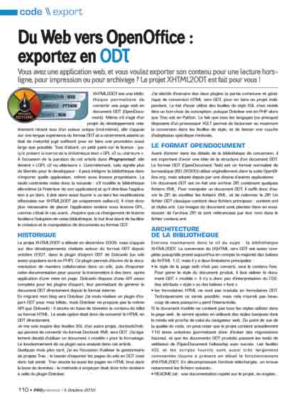 Vous avez une application web, et vous voulez exporter son contenu pour une lecture horsligne, pour impression ou pour archivage ? Le projet XHTML2ODT est fait pour vous !