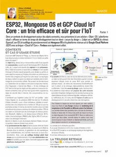 Dans un contexte de développement autour des objets connectés, nous présentons ici une solution « Objet / OS / plateforme cloud » efficace en terme de temps de développement tout en étant « secure by design ». L’objet est un ESP32 du chinois Espressif, son OS (et outillage de provisionnement) est Mongoose OS et la plateforme retenue est ici Google Cloud Platform (GCP) avec sa brique « Cloud IoT Core ». Firebase sera également utilisé.