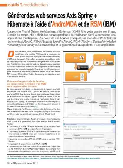 Dans cet article, nous présenterons une mise en oeuvre de la définition d’un modèle PSM jusqu’à la génération du code, à l’aide des outils RSM (Rational Software Modeler) d’IBM et du framework AndroMDA, générateur extensible de code. En particulier, nous nous intéresserons à la génération d’un web service Axis (Spring+ hibernate) partagé par des applications « santé » qui doivent réaliser des recherches sur des patients (bénéficiaires) à propos de leur couverture sociale. Ce web service offre deux principales fonctions de recherche : obtenir un patient sur la base de son NIR (numero SS) et obtenir la liste des patients enregistrés au sein d’une base de données.