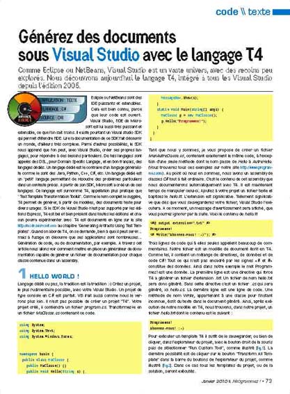 Comme Eclipse ou NetBeans, Visual Studio est un vaste univers, avec des recoins peu explorés. Nous découvrons aujourd'hui le langage T4, intégré à tous les Visual Studio depuis l'édition 2005.